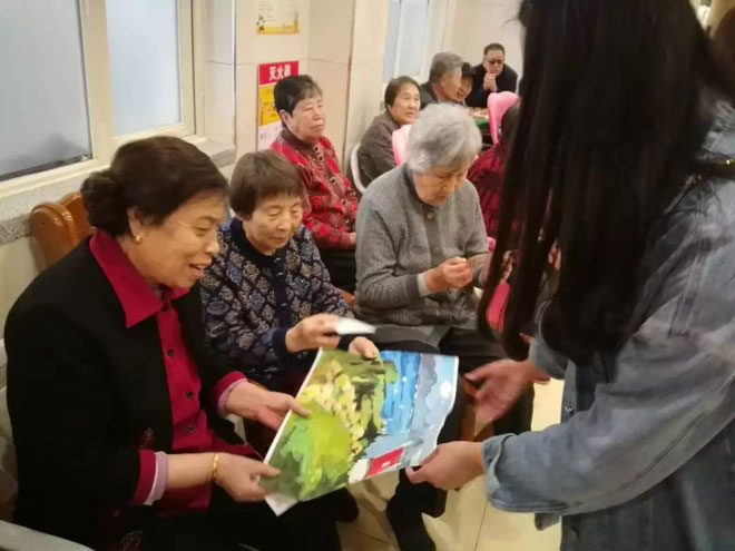 为了给老人们营造一个温馨舒适的气氛,同学们将自己的祝福通过明信片的方式赠送给爷爷奶奶:“愿你的烦恼是线段,有起点,也有终点;你的快乐是直线,没起点,没终点,快乐到永远!”、“您是经霜的枫树,老更红,历经悲欢,愈显得襟怀坦荡,衷心祝愿您生命之树常青”……话虽简朴,但却承载着孩子们最真挚的心意,明信片上勾勒出一幅幅生动地漫画,幸福和甜蜜围绕在爷爷奶奶身边。