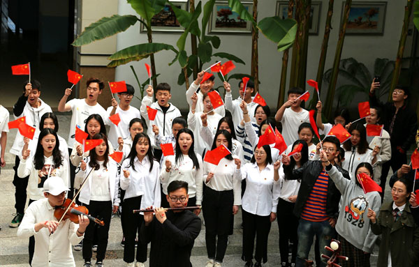 年轻的学子们把心中对祖国的热爱与祝福都化作了同一首歌。人文学院学生马旺对记者说,“当歌声响起的时候,大家所有的热情都是因为有我们这个祖国。爱国的话我们都听过很多,作为新时代的青年,我们应该对此有自己的解读,就是有所追求,同时有所坚守。”