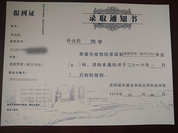 恭喜朴永柱同学被我校录取【沈城建航空】