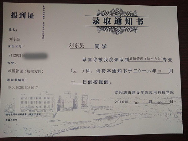 恭喜刘东昊同学被我校录取【沈城建航空】