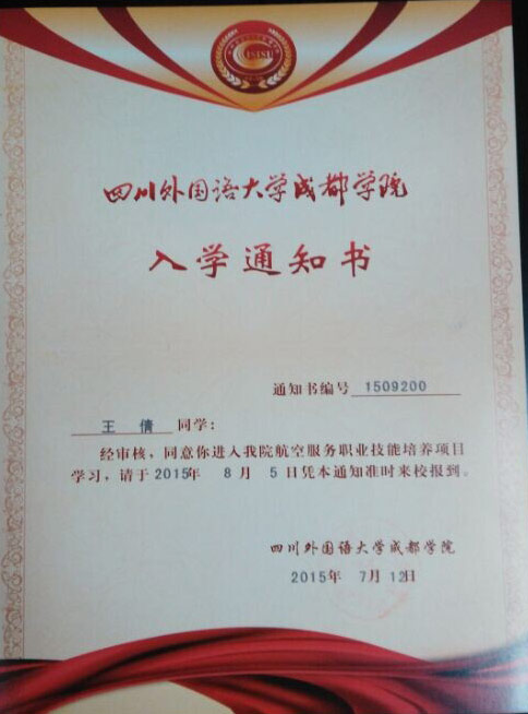 恭喜王倩同学被我校录取【川外成都航空】