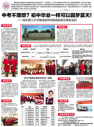4月23日金陵晚报南京2015中招特刊对我项目进行了名为《中考不理想?初中毕业一样可以圆梦蓝天!——南京理工大学继续教育学院国际航空乘务项目》的报道。