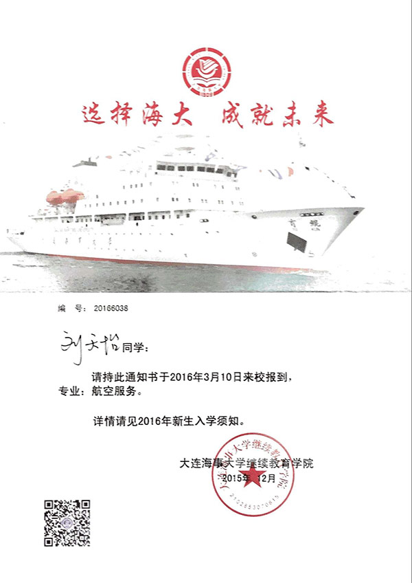 恭喜刘天怡同学被我校录取【大连海事大学航空】