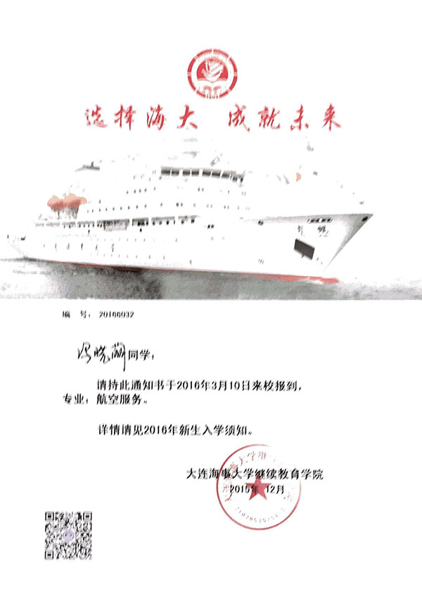 恭喜冯晓萌同学被我校录取【大连海事大学航空】