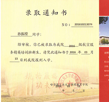 恭喜孙振滢同学被我校录取【哈工大航空】